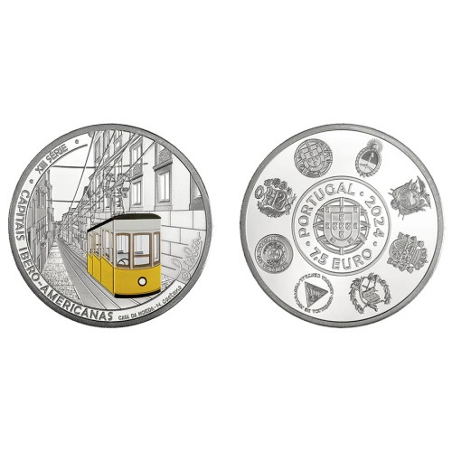 Lisboa, cidade milenar voltada para o Atlântico, é homenageada nesta moeda comemorativa da série Capitais Ibero-Americanas.