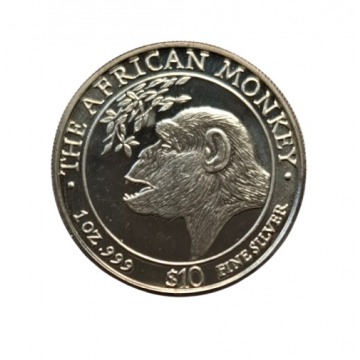 A face mostra o contorno da República da Somália com o ano 1998, e no verso está a cabeça do macaco com a inscrição “THE AFRICAN MONKEY 1 OZ .999 $10 FINE SILVER” e valor facial de 10 dólares somalis.