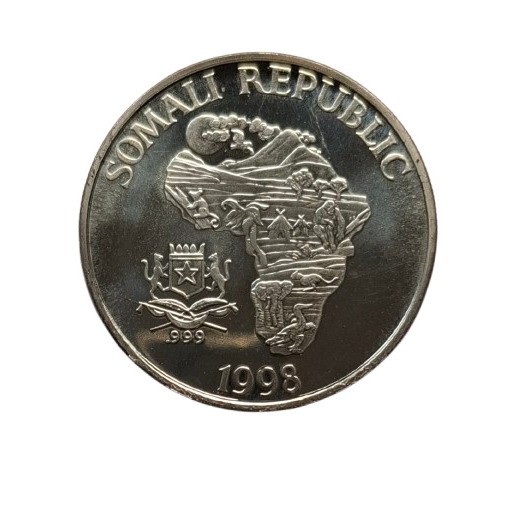 Descrição do Anverso: Mostra o contorno do estado da Somália, com o brasão de armas do estado no lado esquerdo, e as inscrições "SOMALI REPUBLIC" no topo e o ano "1998" na parte inferior