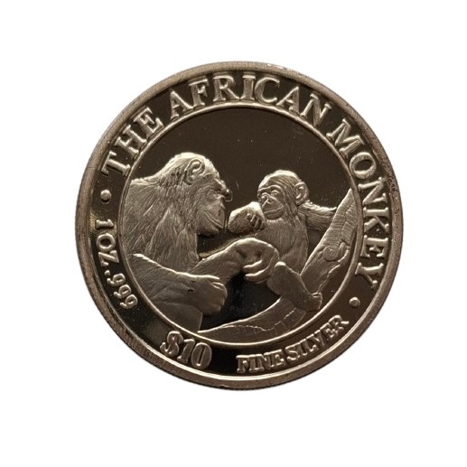 Desenho (Reverso): Mostra dois chimpanzés africanos, mãe e filho, um de frente para o outro. A inscrição "THE AFRICAN MONKEY" e as especificações de peso e pureza ("1 OZ.999 $ 10 FINE SILVER") estão gravadas à volta