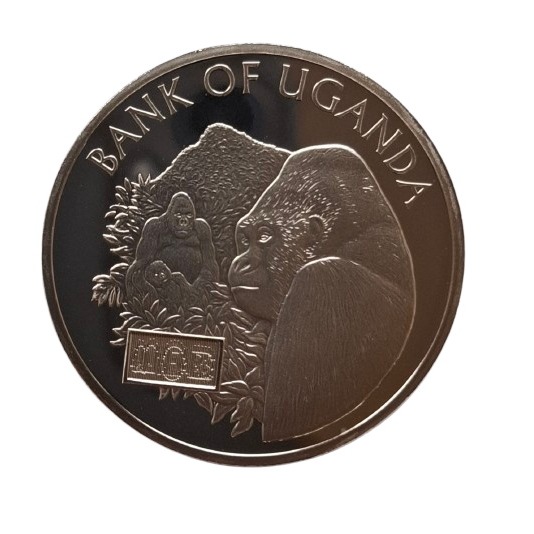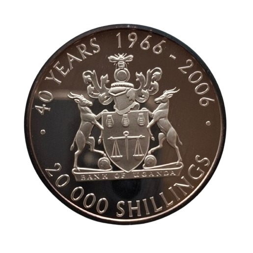 Composição: 99,99% prata fina (frequentemente referida como prata pura 999,9). Emissor: Banco de Uganda. Ano de Emissão: 2006. Finalidade: Comemoração do 40º aniversário do Banco de Uganda.