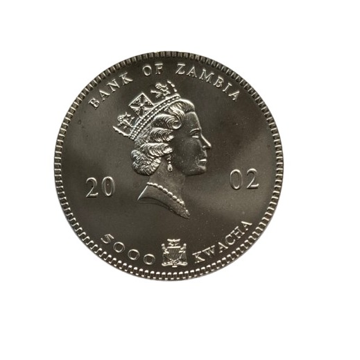 Inscrição BANK OF ZAMBIA e o valor facial 5000 KWACHA abaixo da efígie.